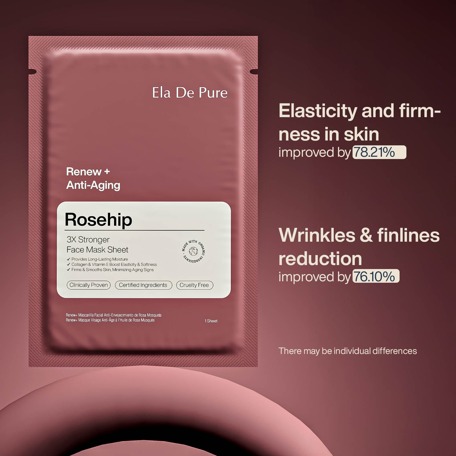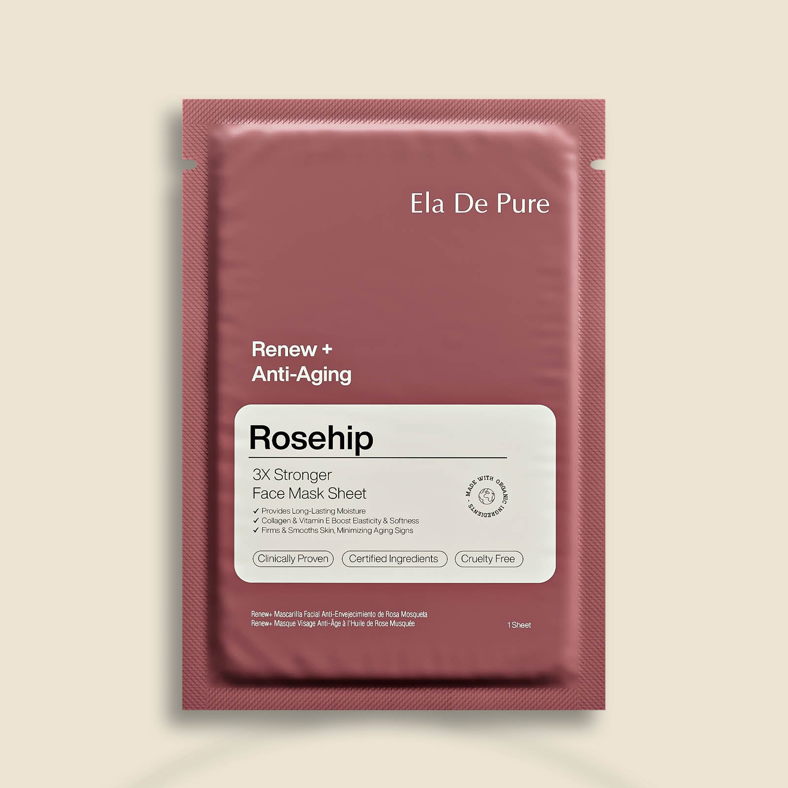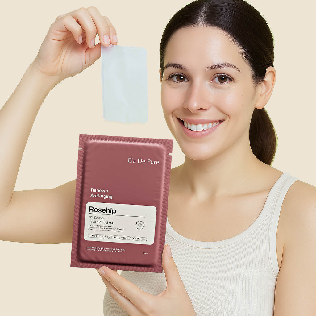 Give your skin a radiant boost with Ela De Pure’s Rosehip Mask Sheet—a premium skincare solution powered by certified, clinically proven ingredients. Designed with 3X serum strength, this ultra-soaked sheet mask delivers deep hydration, stimulates collagen production, and helps reduce fine lines and dullness—all in just 15 minutes.