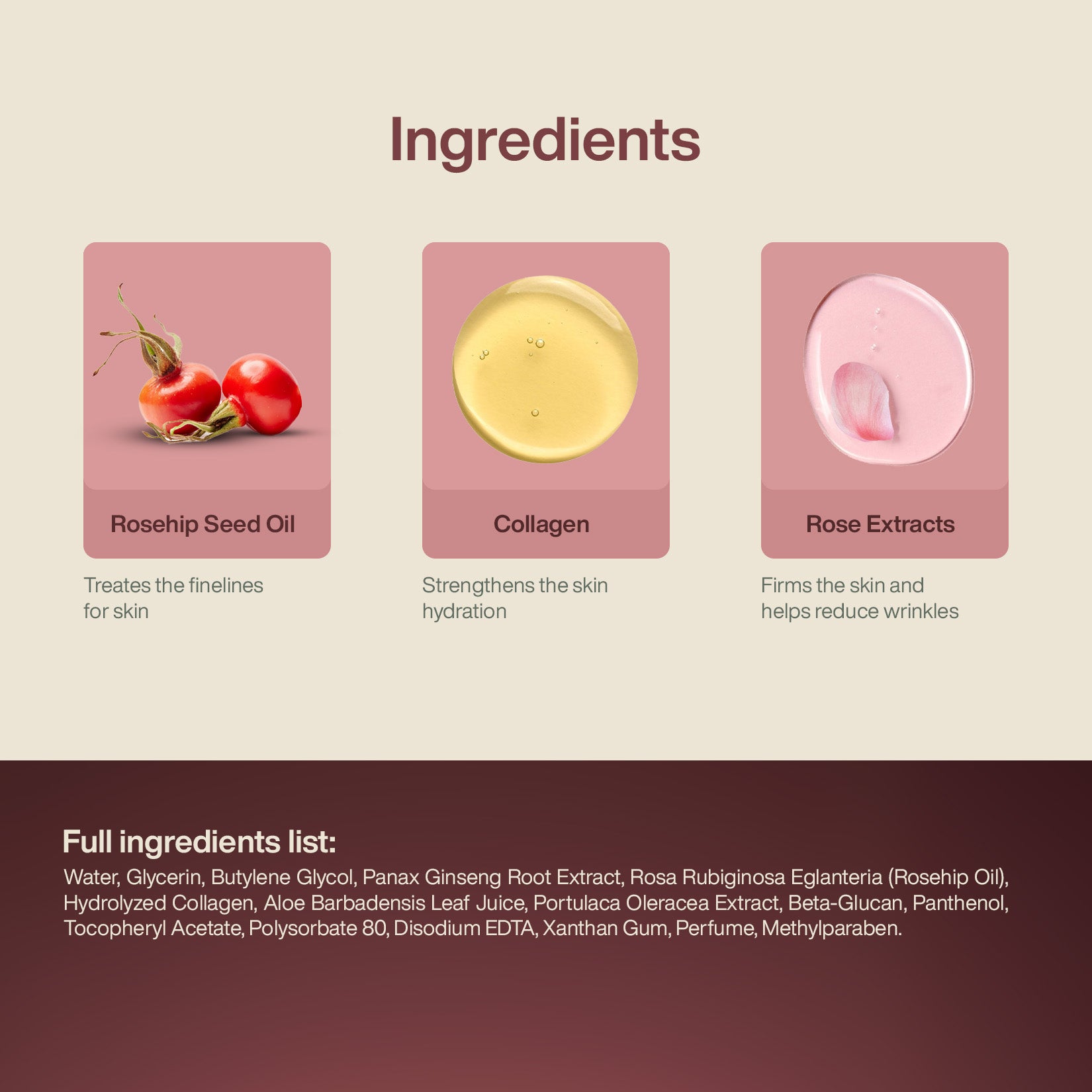 Water, Glycerin, Butylene Glycol, Panax Ginseng Root Extract, Rosa Rubiginosa Eglanteria (Rosehip Oil), Hydrolyzed Collagen, Aloe Barbadensis Leaf Juice, Portulaca Oleracea Extract, Beta-Glucan, Panthenol, Tocopheryl Acetate, Polysorbate 80, Disodium EDTA, Xanthan Gum, Perfume, Methylparaben.